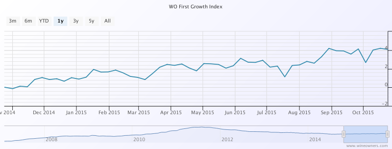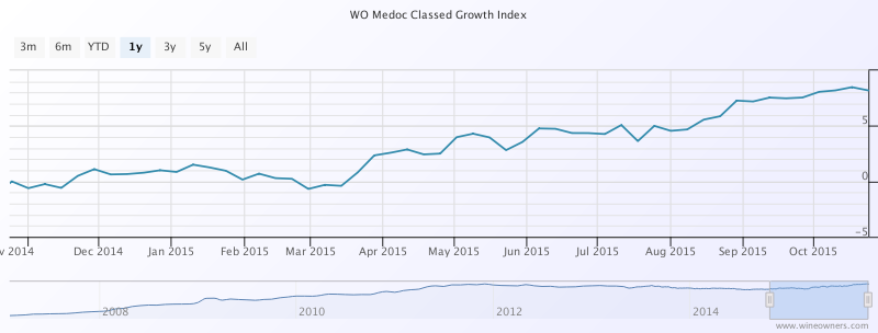 However, it does not mean that in aggregate, prices of Bordeaux have begun an upward trend. In the last year, the Wine Owners Medoc Classed Growth Index is up 8.2%.